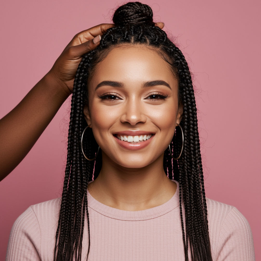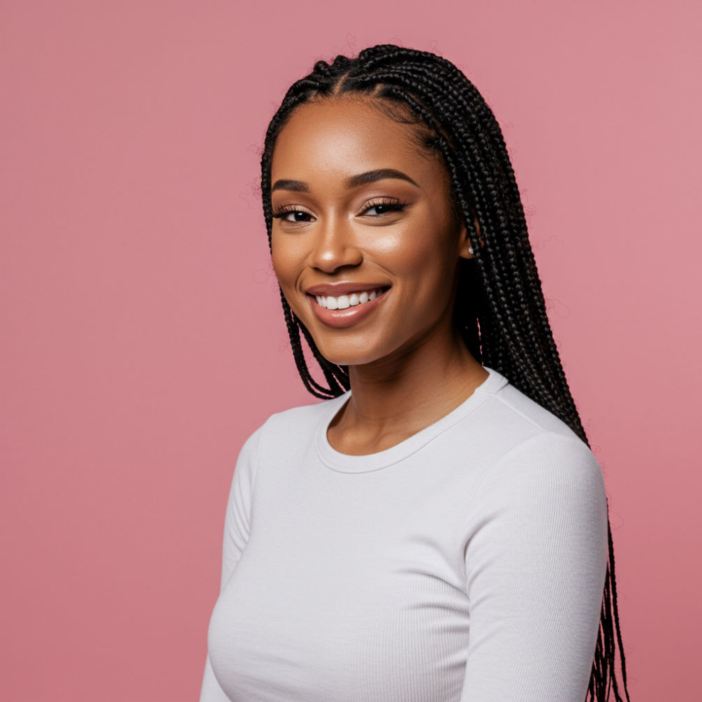 Knotless braids involves braiding natural hair with synthetic hair using a feed-in technique to create a more natural look and reduce scalp tension. This service includes the hair.